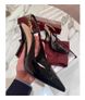 Elegant Patent Leather Stiletto Heels – Pointed-Toe Open-Back Sandals With Metallic Chain Detail